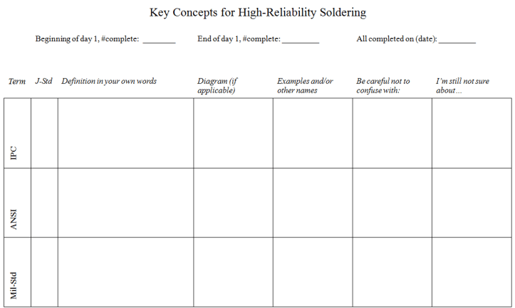 High Reliability Soldering BingoThen, we played vocabulary bingo.  Students marked their bingo cards when I mentioned one of the technical terms (they’re the same ones from the handout above, but arranged alphabetically). The boxes had to be marked with either a definition or the section of the standard that introduced the term.  To win, you had explain the meanings of 5 terms in a row.  The prize was a 10 minute break for the class, to be used at the winner’s discretion (because the intersession is compressed, we have a full day of class in two 3h blocks).