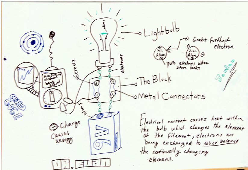 Since then, we’ve discussed, debated, and tested. They’ve responded to my comments and I’ve commented on their responses. The ideas that are supported by several sources and accepted by all groups have become our model of atomic structure. We took that model and tried to figure out what it could tell us about batteries. We practiced separating “what I think or know” from “what the model implies.” Every group recorded what they did on white boards, which I “cam-scanned.” I printed copies for everyone and distributed them. They keep asking fascinating questions about electricity. Even beginning to answer the questions will require us to do all the things in the syllabus, at one point or another. I’ll be damned if I’ll be the one to stop them.