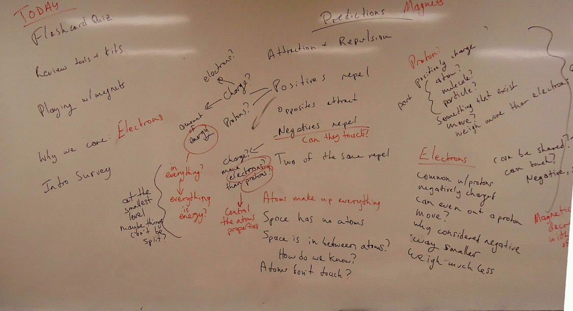 On the very first day, we played with magnets and talked about our ideas. Then we discussed how those ideas might relate to atoms. I practiced some new techniques I wanted to try: writing down everything they said (misconceptions and all), and encouraging clarity (mostly by restricting my comments to “What do you mean by that exactly?” and “How do you know?”). That yielded questions like