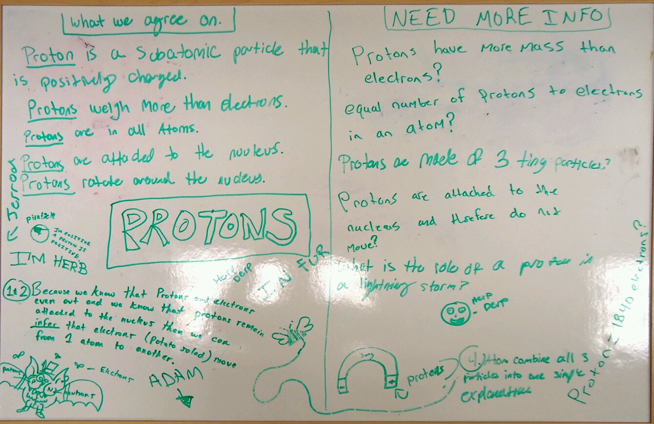 In the first few days of the semester, we brainstormed a list of ideas, vocab, and anything else anyone remembered about magnets, then about atoms. I asked questions, introducing the standards for reasoning by asking “What exactly do you mean by … ” or “How much…” or “How could idea A and idea B be true at the same time?” Any time we reached “I don’t know” or a variety of apparently contradictory answers, I phrased it as a question and wrote it down. This turned out to be a useful facilitation technique, to be used when students were repeating their points or losing patience with a topic. I checked with the class that I had adequately captured our confusion or conflicting points, and stored them for later. Two days into the course we had questions like these: