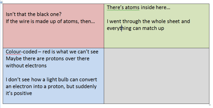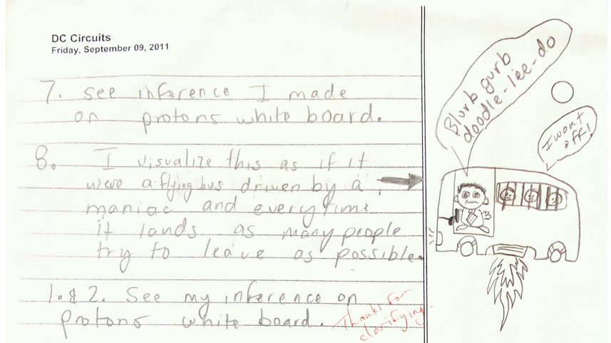 Ok, so this student is known for flights of fancy. But there’s even more to work with here: air as an insulator; the idea of rapid transfers of electrons when they come in contact with certain materials — as if the electrons are trying to get away from something; an opportunity to talk about metaphors and what they’re good for.