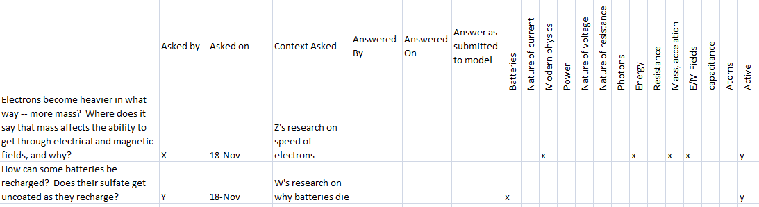 The far left column contains the questions. I keep track of who asked them, when, and why they seemed significant. If that question gets answered, I’ll fill in who proposed the answer, the date it was accepted, and the exact wording as accepted by the class. See all the little Xs on the right? I try to notice which themes are popular, and tag a question with an X for as many categories as it seems to belong to. In the far right column, I can mark the question as active or inactive (if it has been answered, or the class has done some housecleaning and deemed it no longer relevant).
