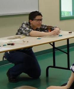 15 min: First mission: figure out how the components work. I showed them the buzzer, button, and motor, and asked them to hook them up to test them.