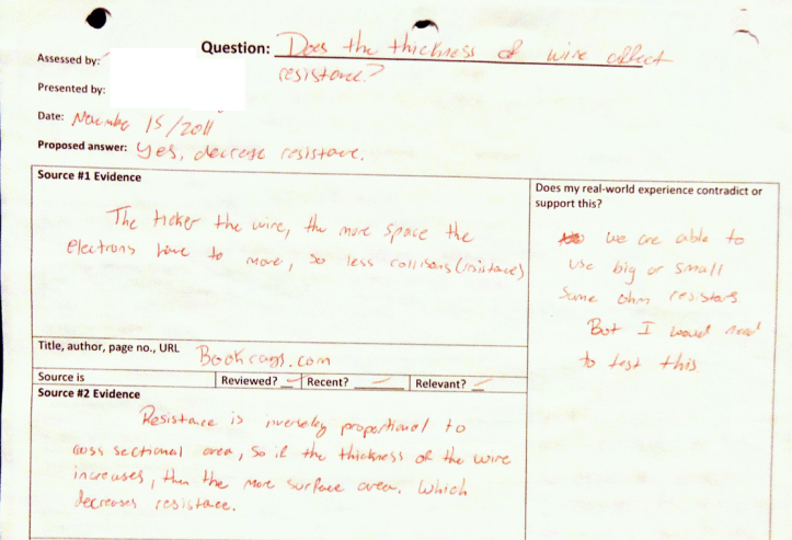 Sometimes I wrote papers myself. This happened if we needed 12 questions answered on a topic, but there were only 11 students. It also happened when we did a round of class discussions only to realize that everyone’s paper depended on some foundational question being answered, but no one had chosen that question. Finally, I sometimes used it if I needed the students to learn a particular thing at a particular time (usually because they needed the info to make sense of a measurement technique or new equipment). This gave me a chance to model strong writing, and how to draw conclusions based on the accepted model. It was good practice for me to draw only the conclusions that could be supported by my sources — not the conclusions that I “knew” to be true.